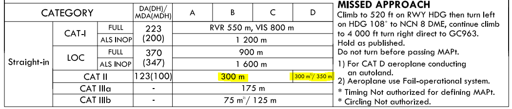 - 인천공항 차트를 보면 CAT2의 RVR 최저치가 approach category에 따라 다르다. C급보다 D급 항공기가 빠른 속도로 접근하는만큼 좀 더 넉넉하게 활주로 시야를 확보할 필요가 있다. 조종사가 판단하고 조작할 수 있는 여유치를 두었다고 이해하면 될 듯하다.