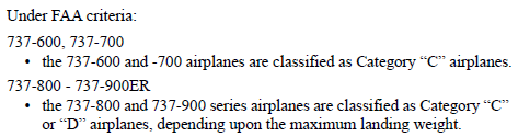 - 참고로 737-800의 경우 900ER과 더불어 C급 또는 D급으로 분류 가능하다. 항공기마다 세부 스펙이 다르다보니 MLDW 역시 제각각일테고, Vref 또한 MLDW에 따라 다르기 때문인 것으로 보인다. 이 외에도 서클링 어프로치를 할 때 접근 속도가 빠르기 때문에 이 경우에는 D급으로 간주한다.