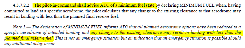 - minimum fuel은 도착 후 남은 연료가 final reserve fuel보다는 많을건데 시간 지체되면 잔여 연료량이 그보다 적을 수도 있다라고 알리는 용어.