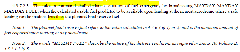- fuel emergency는 착륙 후 남은 연료가 final reserve fuel보다 적을게 확실한 상황. 관제 기관의 확실한 협조가 필요하며 정말 급하다면 취항하지 않는 곳이나 군공항에라도 내려야 한다.