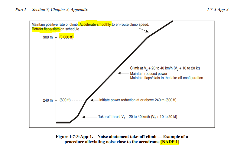 - NADP1 기준 acceleration height는 3000피트이다. 즉 NADP1을 적용하는 공항에서 이륙을 할 때 ALL ENG 정상인 상황이라면 3000피트까지 우선 상승하고, 3000피트부터 속도 본격적으로 올리며 플랩도 접기 시작한다.