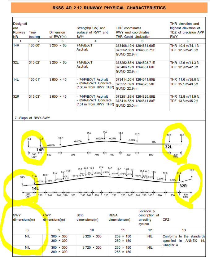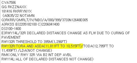 - 최근 김포공항 32R 노탐을 보다가 의문이 생김. TORA와 ASDA가 똑같이 11811ft에서 10515ft로 줄어드네? 그럼 김포공항엔 stopway가 없단 말인데? 근데 김포공항 활주로 끝단에 저 마크가 있는걸로 기억하는데? 한동안 혼동이 왔다.