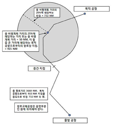 | * 목적공항으로부터 총 비행계획 거리의 25%에 해당하는 지점 또는 총 비행계획 거리의 20%에 50 NM을 더한 지점 중 큰 거리에 해당하는 지점을 중심으로 하여, 총 비행계획 거리의 20%에 해당하는 거리를 반경으로 원을 그려서 그 안에 항로상교체공항이 위치해 있어야 한다. |