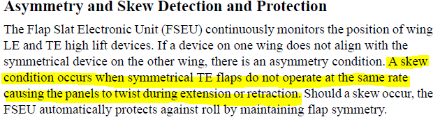 - DISAGREE, ASYMMETRY와 더불어 FLAP 비정상 현상 중 하나. 지상에서 SKEW가 감지되면 takeoff config warning이 작동한다고 함.