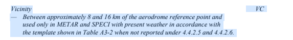 - VC는 vicinity의 약자이며 annex 3에는 Between approximately 8 and 16km of the aerodrome reference point and used only in METAR and SPECI.. 라고 나옴.