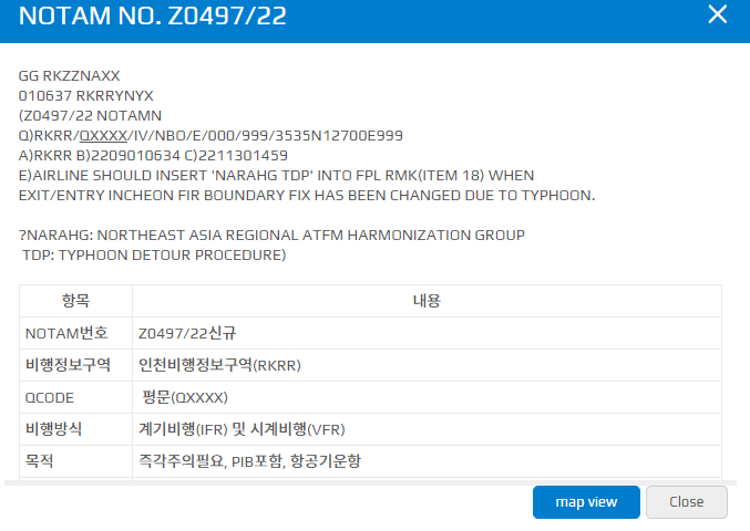 - 항공기가 태풍때문에 우회 항로 절차(Typhoon Detour Procedure)를 이용했구나 한중일 관제 기관이 인지하게끔 하자는게 목적인 것으로 추정. 이를 NARAHG에서 결의하여 NARHAG TDP라고 적는 것 같다.