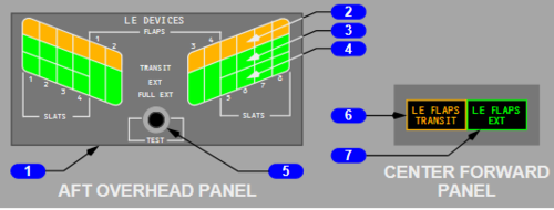- 센터 패널 초록색 LE FLAPS EXT(EXTENDED) 라이트는 LE FLAP이 펼쳐졌을 때 ON. FLAPS 1부터 LE FLAPS는 늘 전개되어 있으므로, UP 포지션이 아니라면 그린 라이트는 늘 켜져있다.