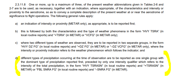 - different types of precipitation occurring at the time of observation are to be reported as one single group with the dominant type of precipitation reported first, preceded by only one intensity qualifier which refers to the intensity of the total precipitation, in the form “HVY TSRASN” (in local routine reports) and “+TSRASN” (in METAR) or “FBL SNRA FG” (in local routine reports) and “–SNRA FG” (in METAR).